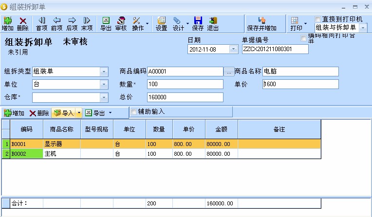 像一般的商品库存管理大家肯定都知道具体怎样操作,但是有些商品既可以作为一个单独的产品有可以拆分了若干个零件来单独计算,比如说电脑,可以整套的销售也可以单卖显示器,那像这类产品怎样在库存里反映呢?这就是我们仓库管理软件生产版的组装拆卸功能。下面具体介绍财易仓库管理软件生产版的组装拆卸功能: