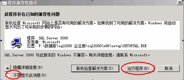 2.打开QL server 2000企业版\sql2000文件夹中的 setup.exe弹出下图勾选不再显示此消息,运行程序