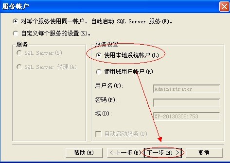 11.选择“使用本地系统账户”;