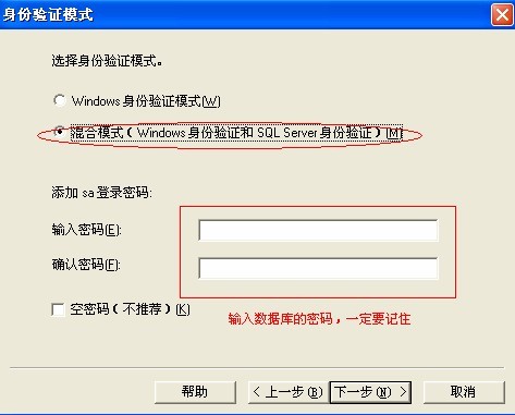 12.选择“混合模式(Windows身份验证和SQL Server身份验证)”并输入数据库密码;
