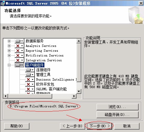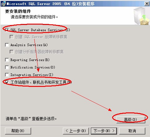 进入下一步根据自己的需要选择安装组件,如下图勾选“SQL Server Database Services”与“工作站组件、联机丛书和开发工具”,选择【高级】选项进行安装路径以及功能选项设。
