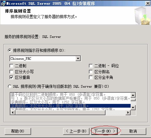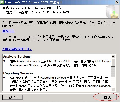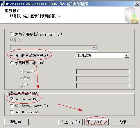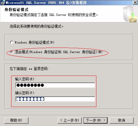 如果计算机上没有安装SQL 2000,则可以选择默认实例,若安装了SQL2000则需要输入命名实例,例如sql2005。选择“使用内置系统账户”,在身份验证模式下选择“混合模式”并输入密码(注意密码必须要符合强密码要求,可参考帮助文档设置密码)。根据安装向导默认选项完成安装。
