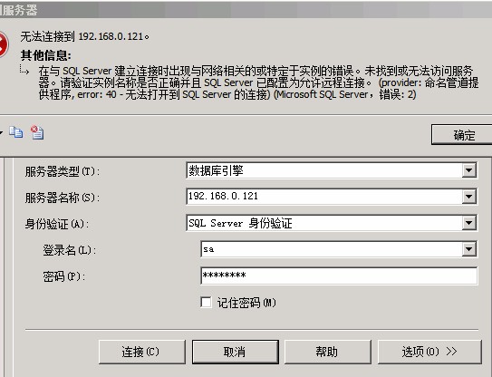SQL 2005在安装时选择默认实例,数据库安装完成后,在SQL Server Management Studio连接实例时,在服务器名称输入框中输入“.”可以连接,若输入“服务器IP地址”点击登录时则会出现如图示(provider:命名管道提供程序,error:40-无法打开到SQL Server 的连接)