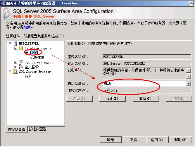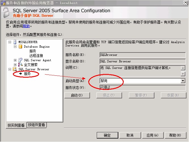 检查完【SQL Server Configuration Manager】后再打开【服务和连接的外围应用配置器】(位于开始—所有程序—Microsoft SQL Server 2005—配置工具—SQL Server外围应用配置器),选择SQL Server Browser的服务启动类型为“禁用”,服务状态也是“已停止”。我们只需要将启动类型修改为“自动”并启动服务。