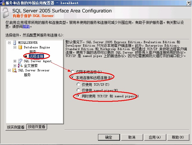 同时选择默认实例的【服务】与【远程连接】选项,服务启动类型也修改为“自动”,设置远程连接为“本地连接与远程连接”和“同时使用TCP/IP和named pipes”选项。
