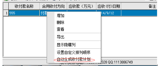 1.选择一个合同,在下面从表中选择收付款计划计划,点击右键: