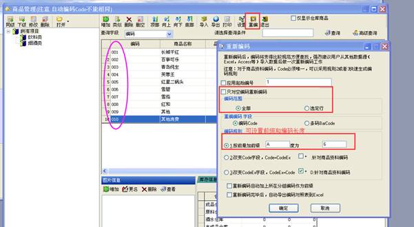 可以选择对全部商品重编,也可以选择选定行进行重编;同时也可以设置添加前缀和编码的长度等设置。点确定后,编码就自动编好啦。